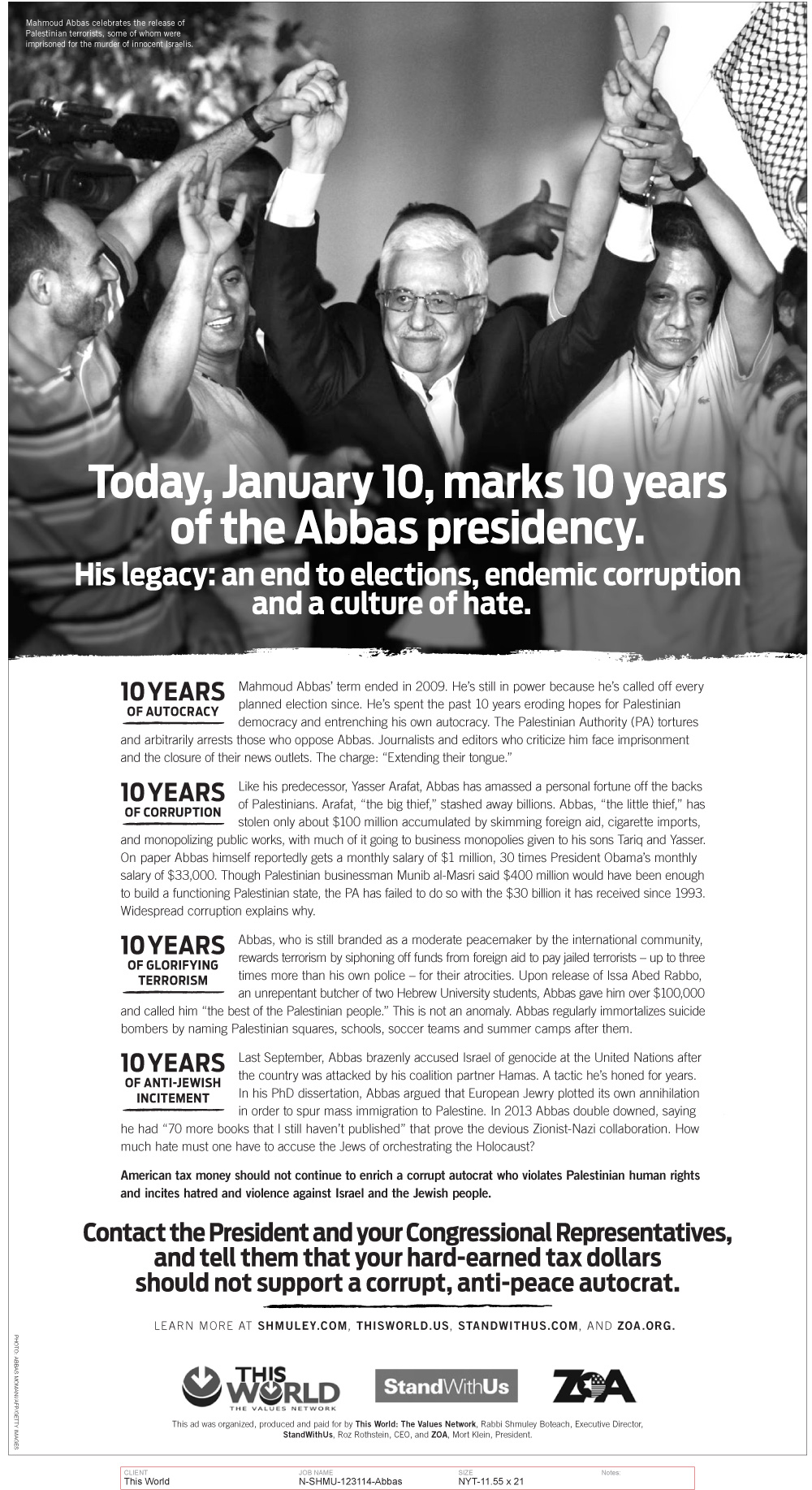 ZOA Ad in NY Times Condemning PA’s Terror-promoting Dictator Abbas