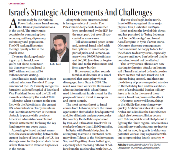 ZOA Michigan Director Op-Ed on Israel’s Achievements/Challenges
