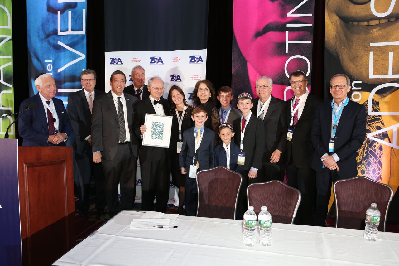 ZOA Chair Mark Levenson presented Mort Klein with ZOA’s Theodore Herzl Award for 25 years of outstanding Service to the Zionist Organization of America. He then called Mort’s wife Rebecca (Rita), who has shared over 40 years of life with Mort, to the stage along with Daughter Rachael, husband David and grandchildren Elijah, Isaac, Levi and Micah who flew in from Phoenix. Mort’s Brother, Dr. Samuel Klein, Danforth Professor of Medicine, and Chair of the Center for Human Nutrition and Georontology, at Washington University, St. Louis, joined them on the stage. A tribute was mentioned of Mort’s 96 year old Holocaust survivor mother as well.