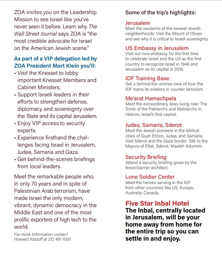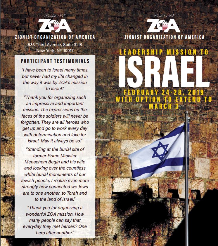 I look forward to you joining my wife Rita and me on this fabulous, unique, one-of-a-kind ZOA Leadership Mission to Israel. Together we will visit the new Embassy in Jerusalem for a possible briefing with U.S. Ambassador to Israel, David Friedman, if he is available. We will meet with Knesset members and Cabinet Ministers. We will travel to Hebron, the Gaza Border, Gush Etzion, and so many other sites. You will return from this extraordinary trip more inspired and more informed about Israel than you ever thought possible. It will equip you with the tools necessary to become an even more effective advocate for Israel. Don’t miss this once in a lifetime experience. I look forward to meeting you personally and spending time with you.
