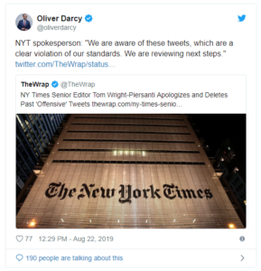 It remains to be seen what will happen next, but now that the Times in its first statement on the matter has confirmed the tweets were a violation of its rules, action appears to be on the horizon.