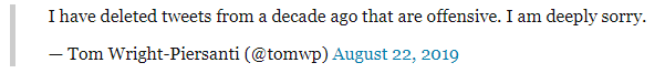The statement, provided to The Wrap and quoted on Twitter by CNN writer Oliver Darcy, comes more than six hours after Breitbart News first published an exclusive expose into New York Times’ politics editor Tom Wright-Piersanti’s racist and antisemitic tweets. After Breitbart News’ original piece, Wright-Piersanti deleted many of the tweets admitting they were “offensive” and apologized.