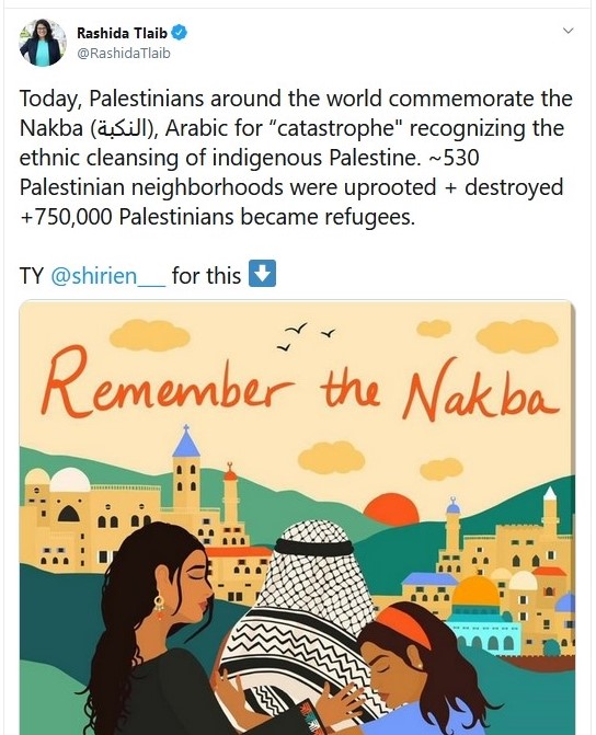 Tlaib falsely claimed in her tweet that 750,000 Arabs were made refugees. Most historians agree that 350,000 Arabs left the area mostly at the behest of their leaders and not through any action by Israel or pre-state Jews. Also, if 5 Arab nations had not invaded Israel there would not have been a single so called Arab refugee. The Arab attempt to destroy the fledgling State of Israel and murder its Jewish inhabitants caused the refugee issue. No Arab war-no refugees