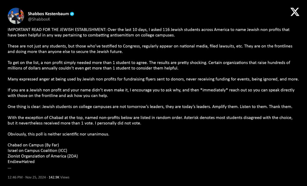 This informal poll was conducted by noted Jewish student activist Shabbos Kestenbaum, who stood up to antisemitism on his Harvard University campus, including by testifying before Congress. Shabbos asked 116 Jewish students across America to name Jewish groups that have been helpful in combatting antisemitism. He approached students who, like Shabbos, are “on the frontlines and doing more than anyone else to secure the Jewish future.” These students identified ZOA, among a small group of other organizations. Shabbos posted the results of his informal poll on X (shown below).