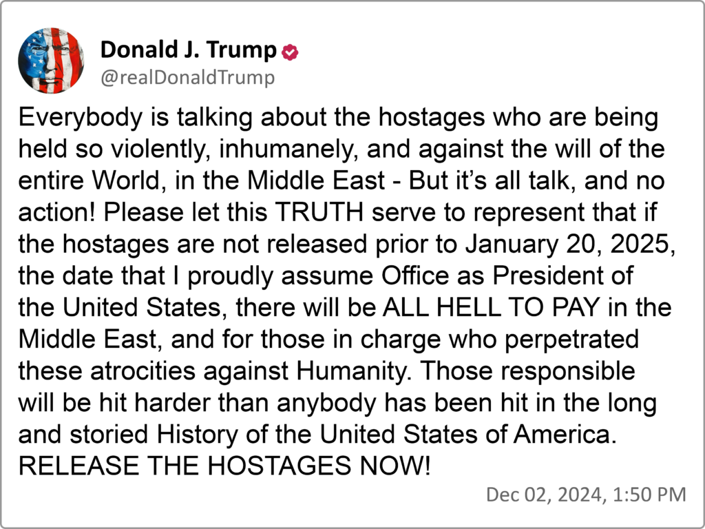 “Everybody is talking about the hostages who are being held so violently, inhumanely, and against the will of the entire World, in the Middle East – But it’s all talk, and no action! Please let this TRUTH serve to represent that if the hostages are not released prior to January 20, 2025, the date that I proudly assume Office as President of the United States, there will be ALL HELL TO PAY in the Middle East, and for those in charge who perpetrated these atrocities against Humanity. Those responsible will be hit harder than anybody has been hit in the long and storied History of the United States of America. RELEASE THE HOSTAGES NOW!”